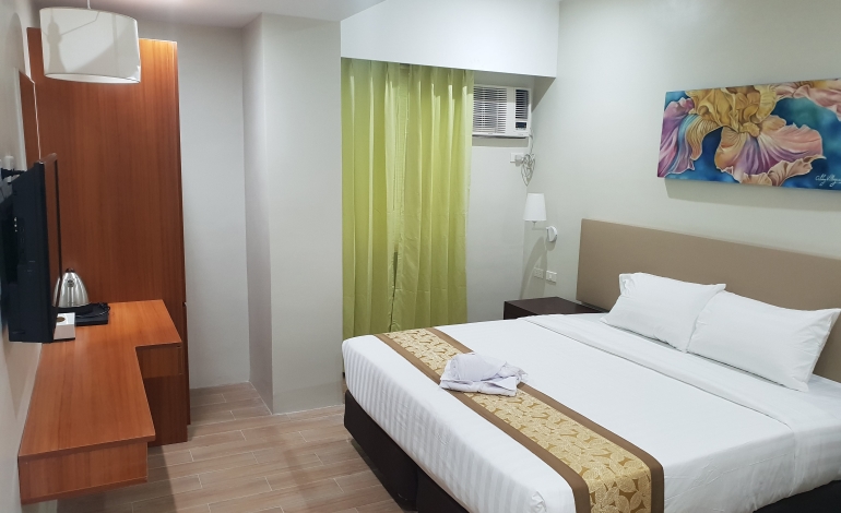 This is room is equiped with 1 comfortable king-sized bed, a 24" LED TV, a personal refrigerator, a private bathroom with hot and cold shower, an electric kettle, a telephone, and an Airconditioning unit.