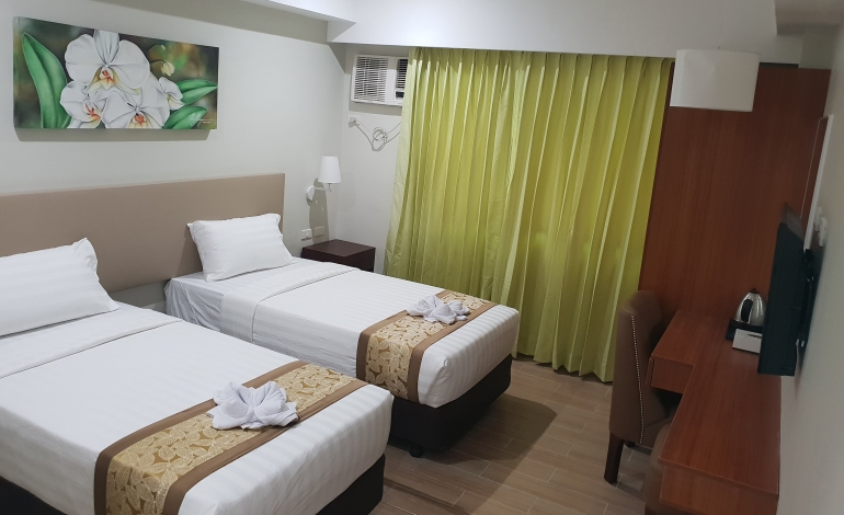 This is room is equiped with 2 comfortable single beds, 24" LED TV, a personal refrigerator, a private bathroom with hot and cold shower, an electric kettle, a telephone, and an Airconditioning unit.